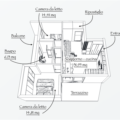 - luminoso soggiorno con cucina a vista di circa 32 m²;