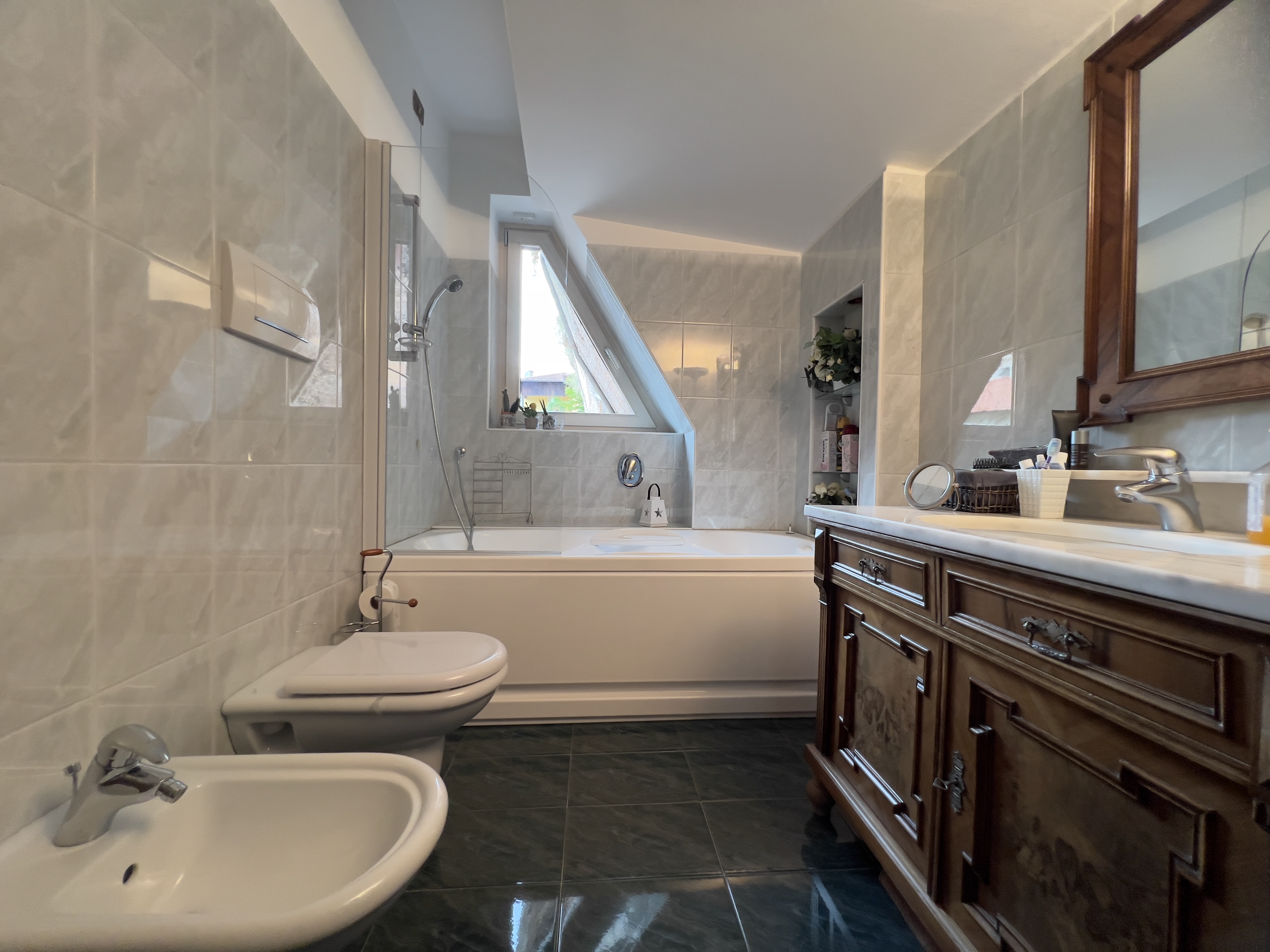 Al secondo piano si trovano due camere ben proporzionate, una delle quali dispone di un elegante balcone in marmo esposto a sud, con una vista suggestiva sul castello cittadino. Il piano è completato da un bagno luminoso con finestra e comoda vasca da bagno, che valorizza ulteriormente l’abitazione.